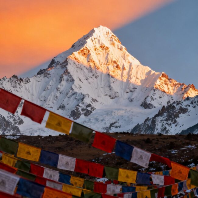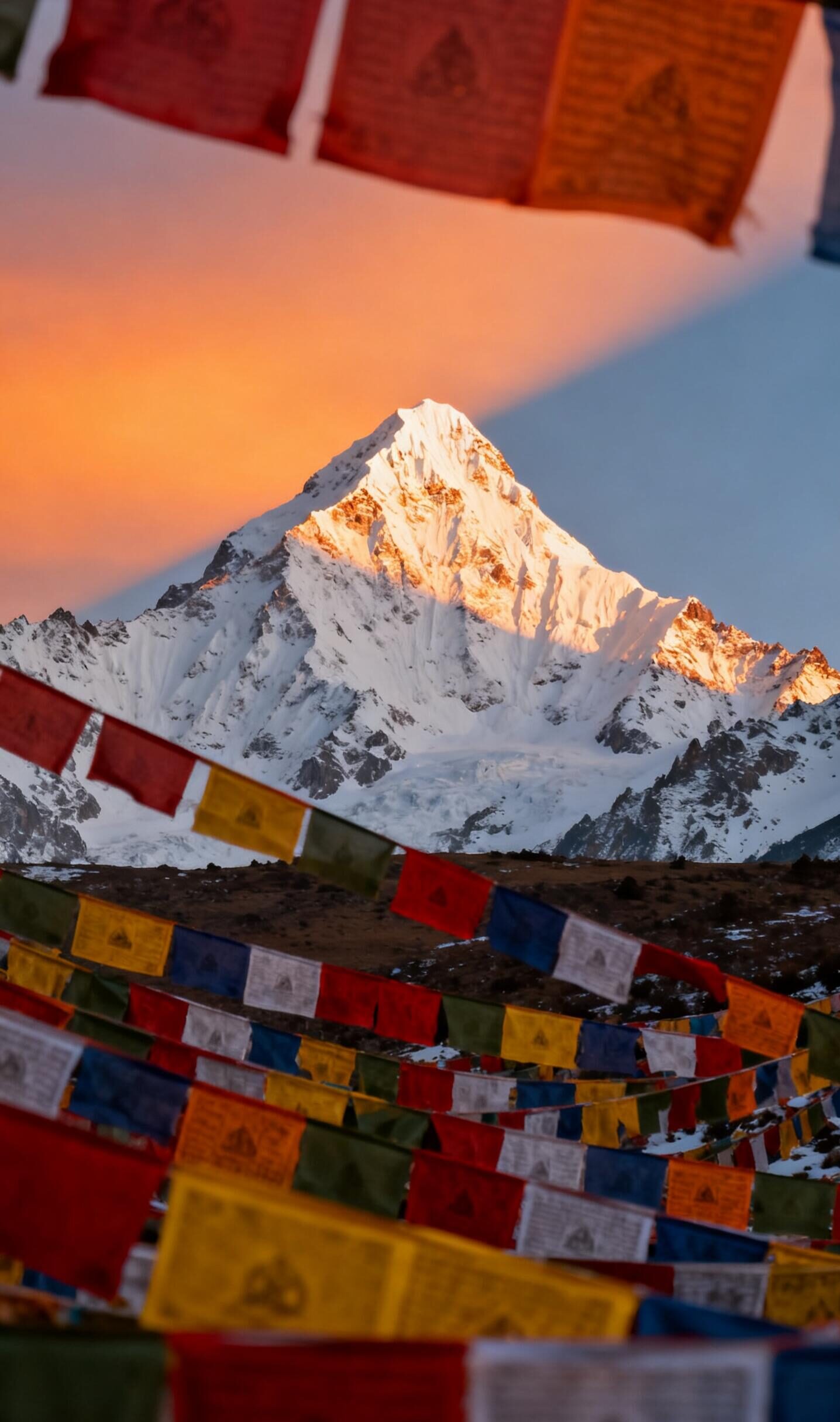 在寂静平台远眺雄伟的降布神山。神山与漫天经幡,进行片刻静默,完成出发后第一次与藏地自然神圣的精神对话,挂上祈福的经幡。